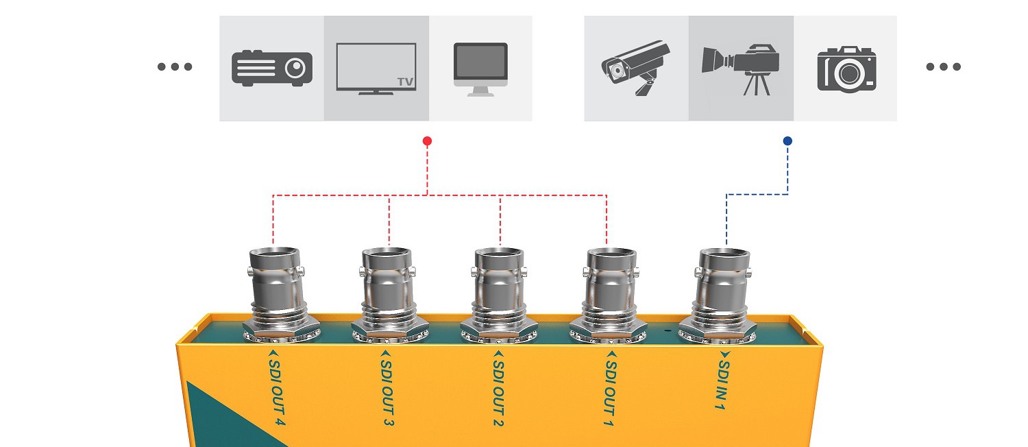 AVMATRIX SD1141 – это компактный усилитель-распределитель с одним входом и четырьмя выходами SDI, со скоростной обработкой SDI видеосигналов до 1080P 60Гц (2,97 Гбит/с). Выход 2 и выход 4 поддерживают сигнал DVB-ASI.
