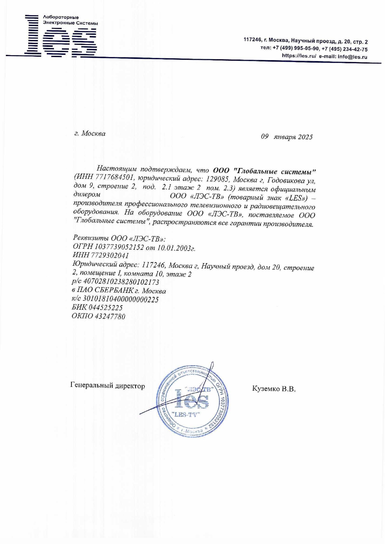 ООО «Глобальные системы» является официальным дилером «LES» - производителя профессионального телевизионного и радиовещательного оборудования. На поставляемое нами оборудование LES распространяются все гарантии производителя.